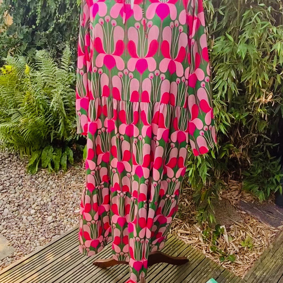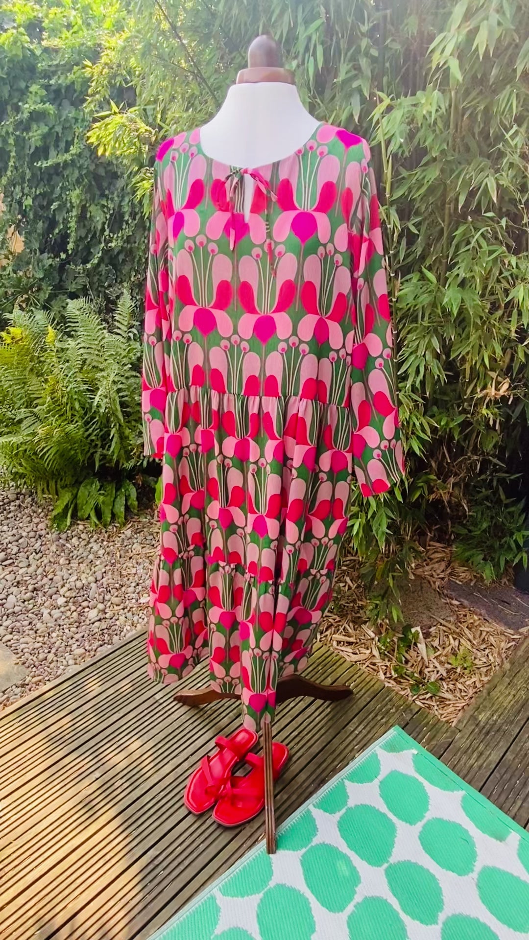 Frida dress and maxi dress has two frill tiers (depending on which length you select), side pockets, a keyhole neck opening with either ties or loop and button fastening, three quarter length gathered elasticated sleeves or short turned back cuff sleeves. You can mix and match to suit you. This is a lovely fun project to make a relaxed, everyday dress.