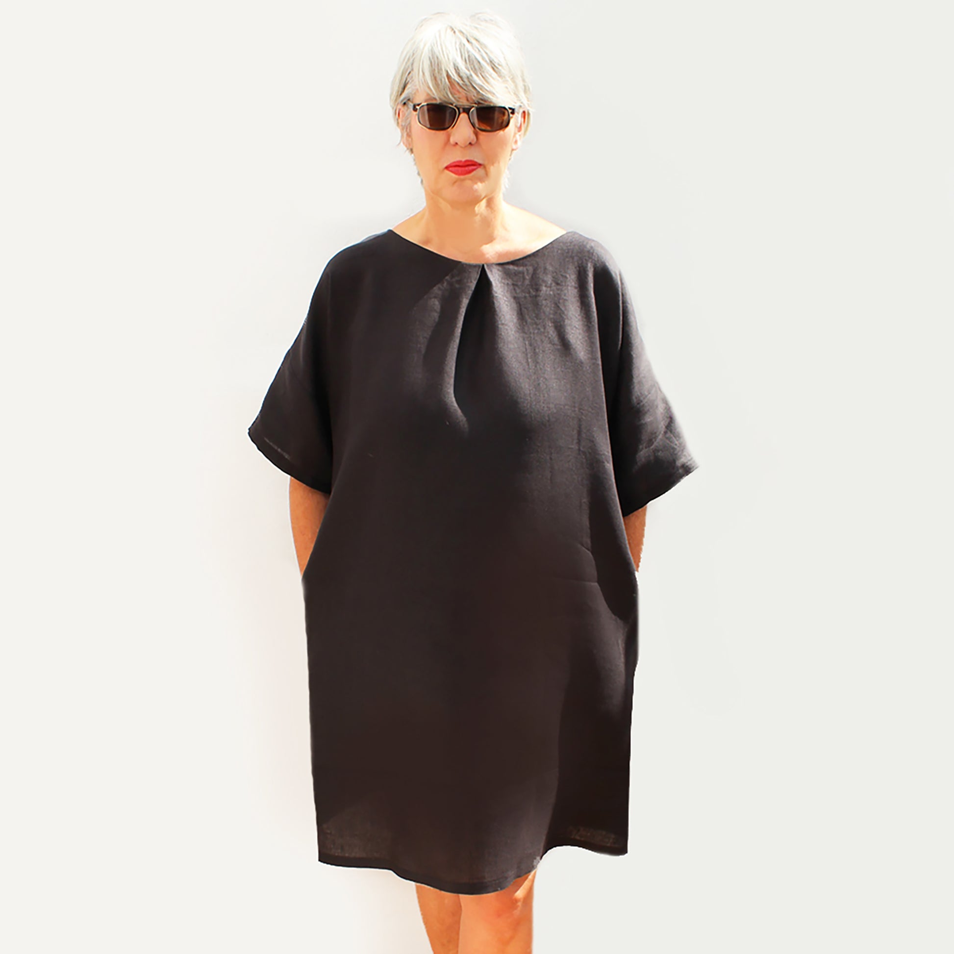 Hilda is a simple, loose fitting round neck tunic with two generous side pockets, a front neck pleat detail and short sleeves. If you would like to see how the tunic is constructed before you buy, visit www.sewgirlblog.com/Hilda tunic. You can also see pattern hack info and extra tips about how to adapt the pattern.