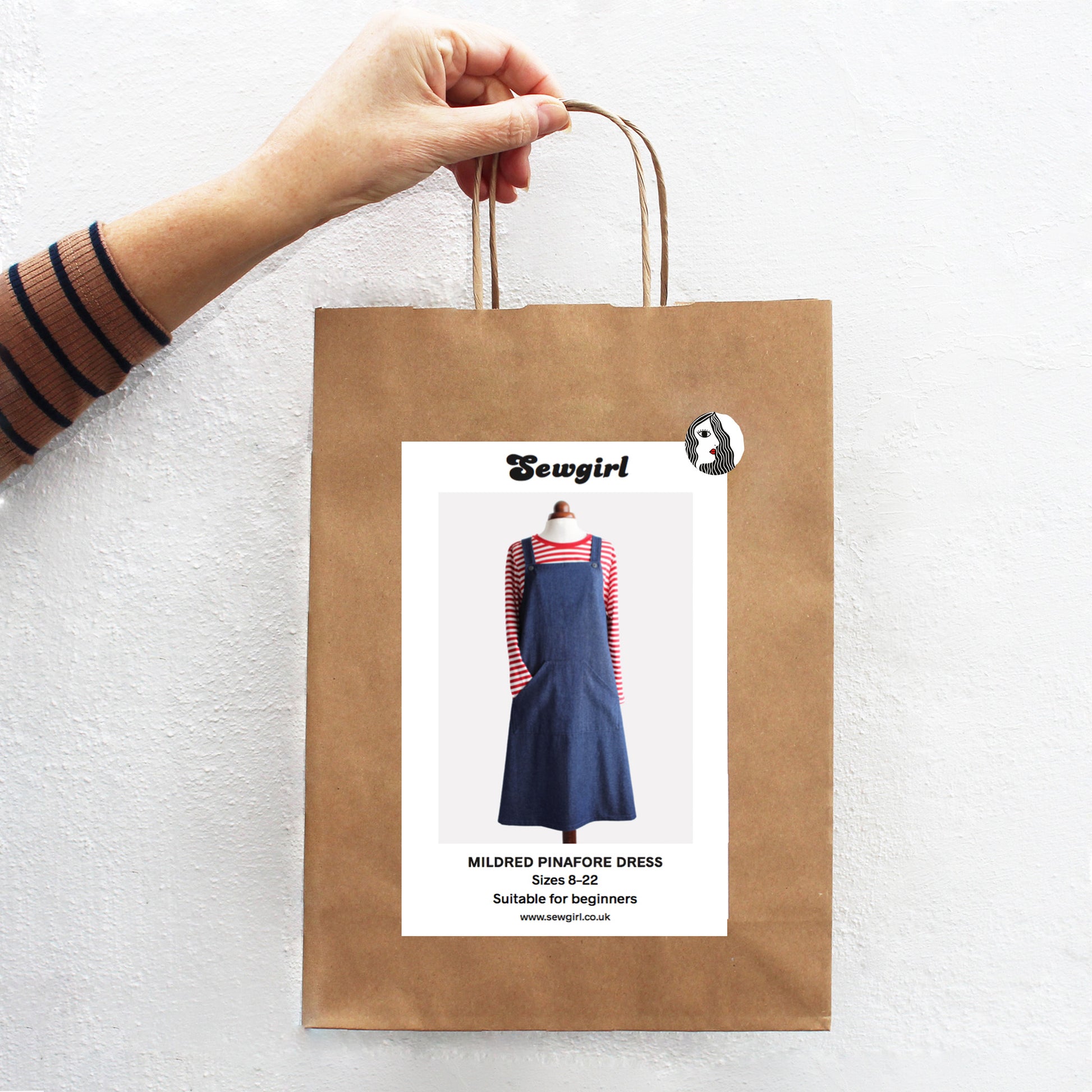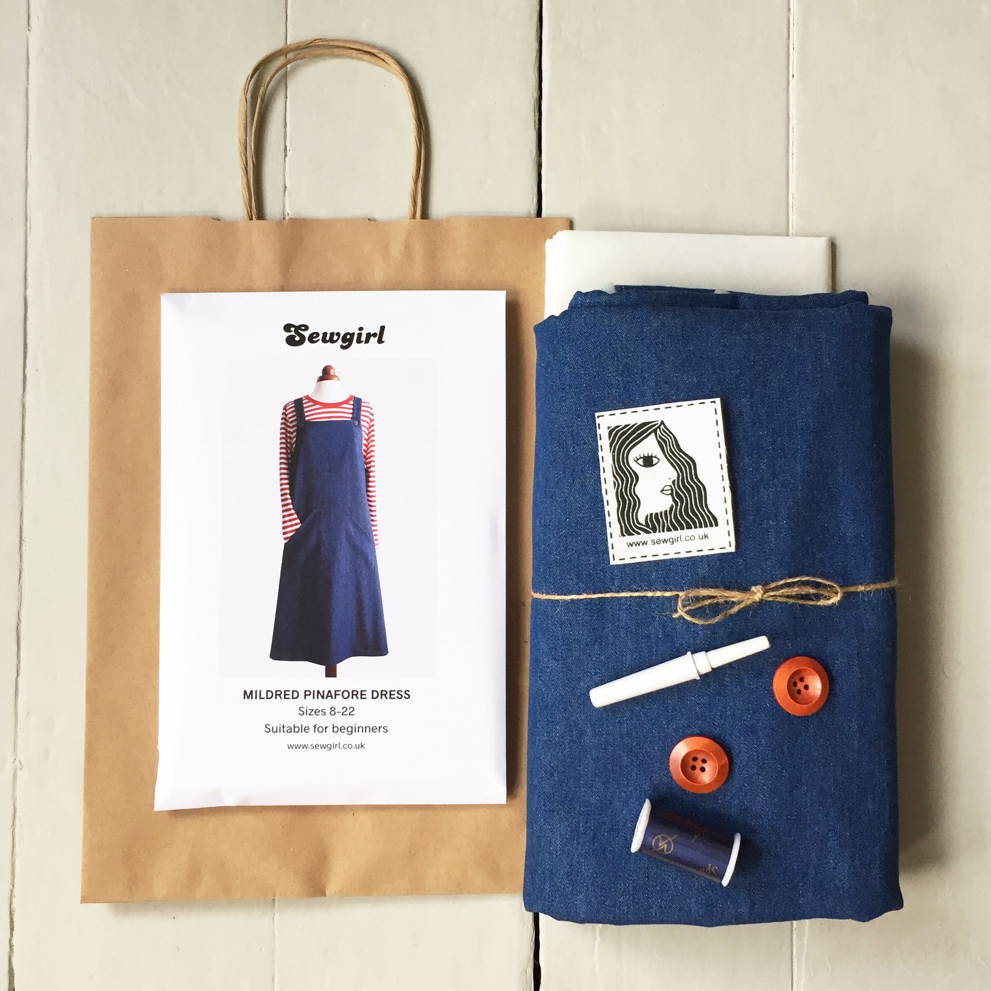 This is a complete KIT containing Sewgirl MILDRED PINAFORE DRESS sewing pattern, instructions and fabric, which would make the perfect gift for any beginner to dressmaking. An easy straightforward project to make a stylish pinafore in long or short lengths for sizes from 8 to 22. For size and finished garment measurements, please see the size chart in the last picture.