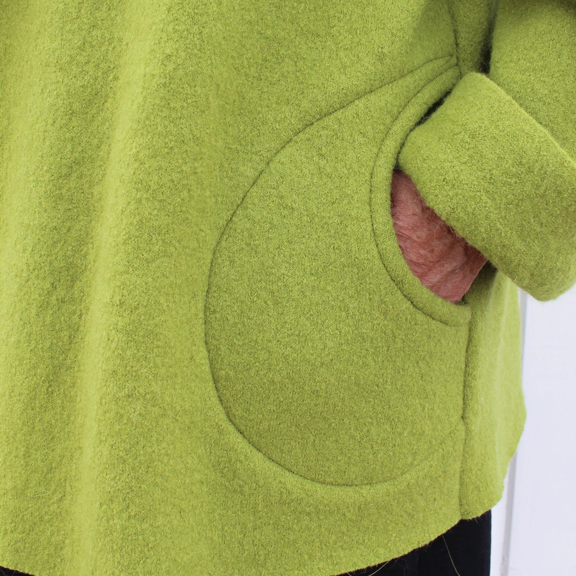 Ursula is a simple and straightforward project to make an unlined relaxed duster style coat or a cardigan type jacket, suitable to make in a variety of fabrics such as linen or cotton for summer/autumn or wool and wool mix fabrics for cooler weather. It can be made in a short jacket or long coat length, with a round neck, long or three quarter length sleeves, rounded side pockets detail (see pics) and an optional back belt. I have suggested using giant covered buttons and snap fasteners to give the coat a retro feel (available from the haberdashery listing), but you can put buttonholes on instead if you prefer.