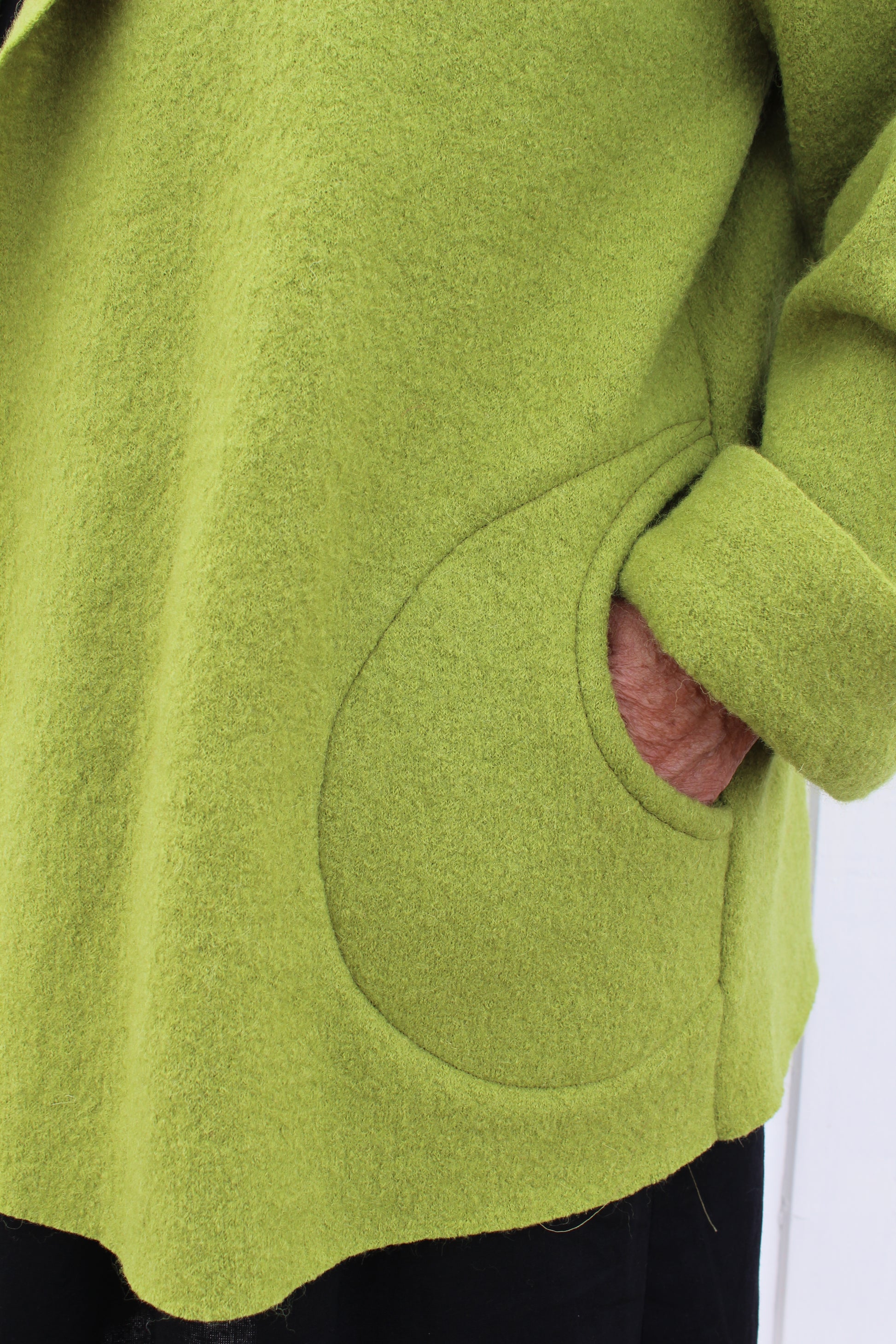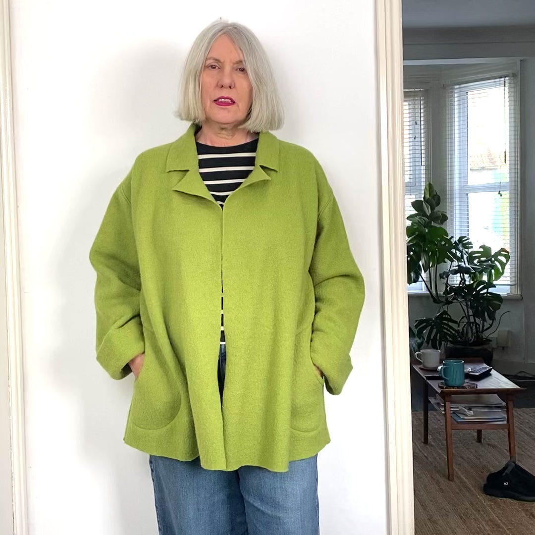 A sewing pattern to make an 'Ursula' Coatigan in a choice of two lengths: long or jacket length. The stylish cardigan coat has a round neck, features nifty rounded side pockets and snap on buttons. Easy to make, this pattern is suitable for beginners to dressmaking with some previous sewing experience and is available in sizes 8-22. NEW! Now included in the pattern is the Ursula Hack jacket, a waterfall style cardigan suitable for the short length version.The hack (shown in green fabric) involves leaving off the facings and band and adding a back neck piece and cuffs using the add-on templates included with the pattern. It is suitable for boiled wool fabric only.